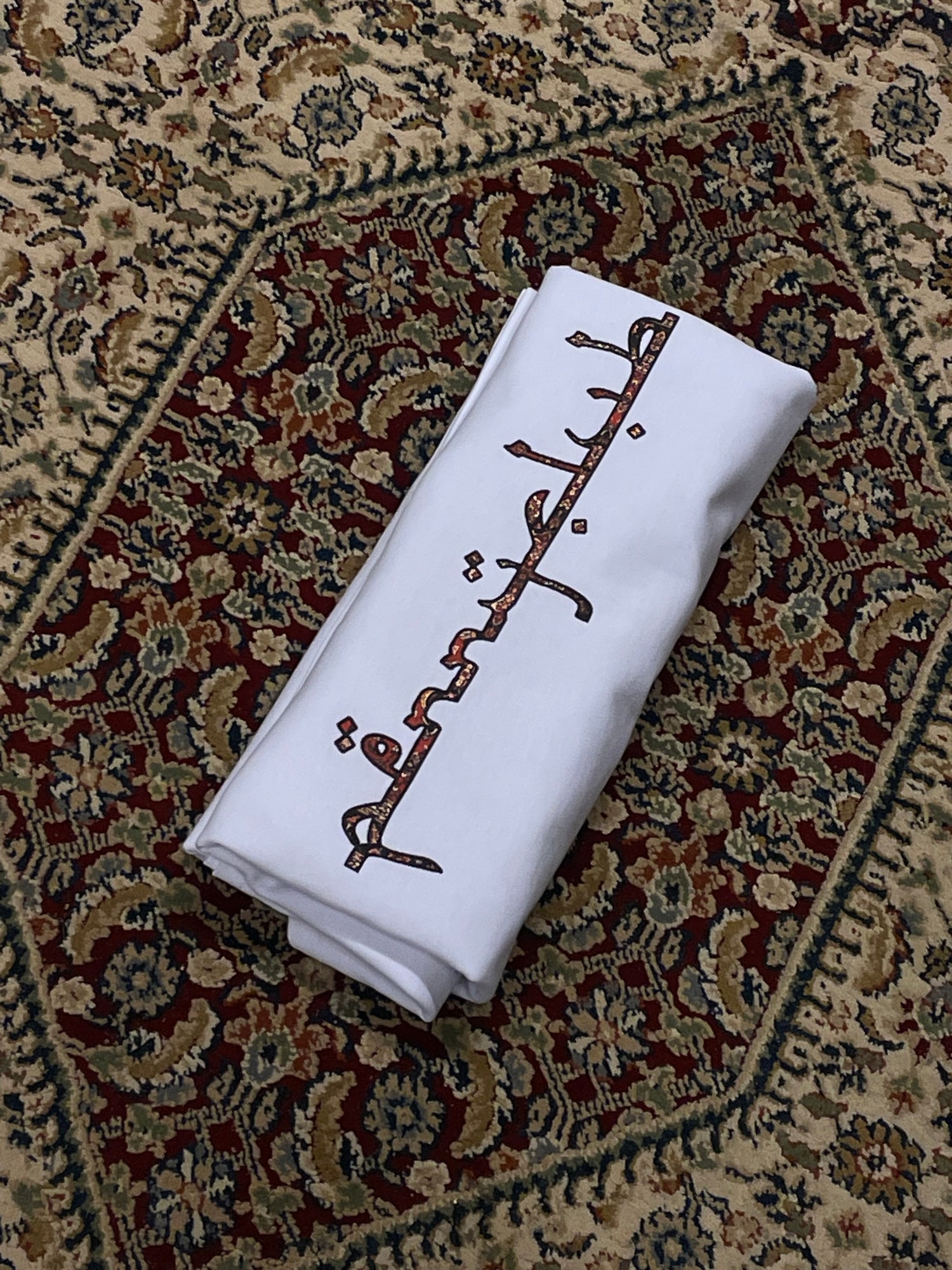 This tee features an elegant Arabic-style script filled with an intricate Persian carpet pattern. The detailed motif draws inspiration from centuries-old craftsmanship, reimagined in a modern graphic form